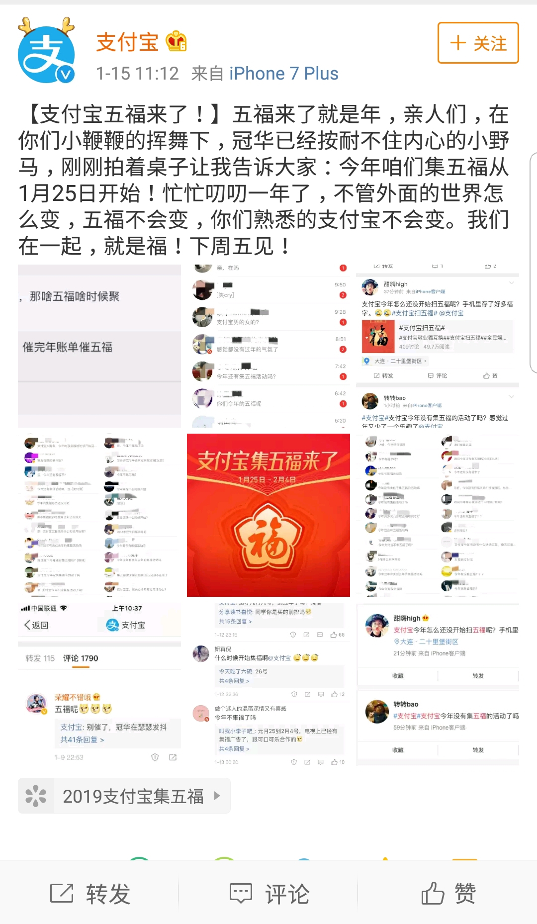 網(wǎng)友們紛紛表示“又是熟悉的五?!?、“好激動(dòng),一大股年味撲鼻而來”、“又要參加好幾個(gè)億的項(xiàng)目了”,最有創(chuàng)意的還屬呼吁支付寶掃福還花唄的。雖然每年掃福分到的錢僅有兩塊左右,但是可以看出大家都充滿了歡樂。