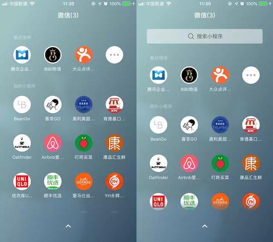 此外,小程序搜索框的露出更明顯了。小程序搜索框原本隱藏在較深的位置,主要的入口有2個(gè),“發(fā)現(xiàn)”-“小程序”內(nèi)以及聊天主界面搜索框中選擇“小程序”的分類。