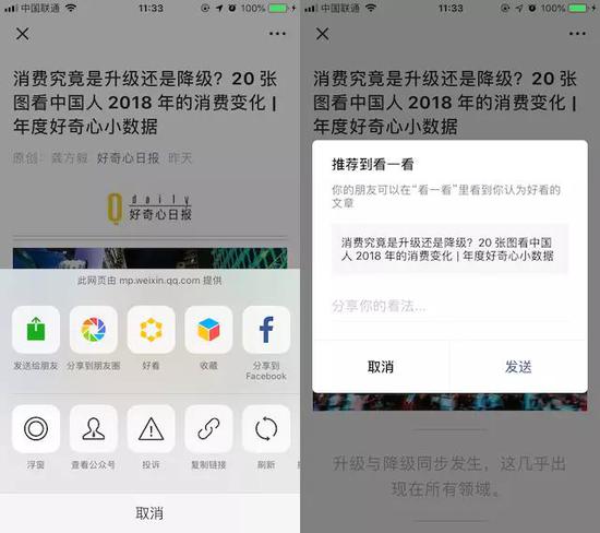 另外還可以提一句的是,微信強(qiáng)化了“看一看”的分享渠道。用戶在朋友圈、微信公眾號看到的文章可以直接選擇“好看”,分享至“看一看”。